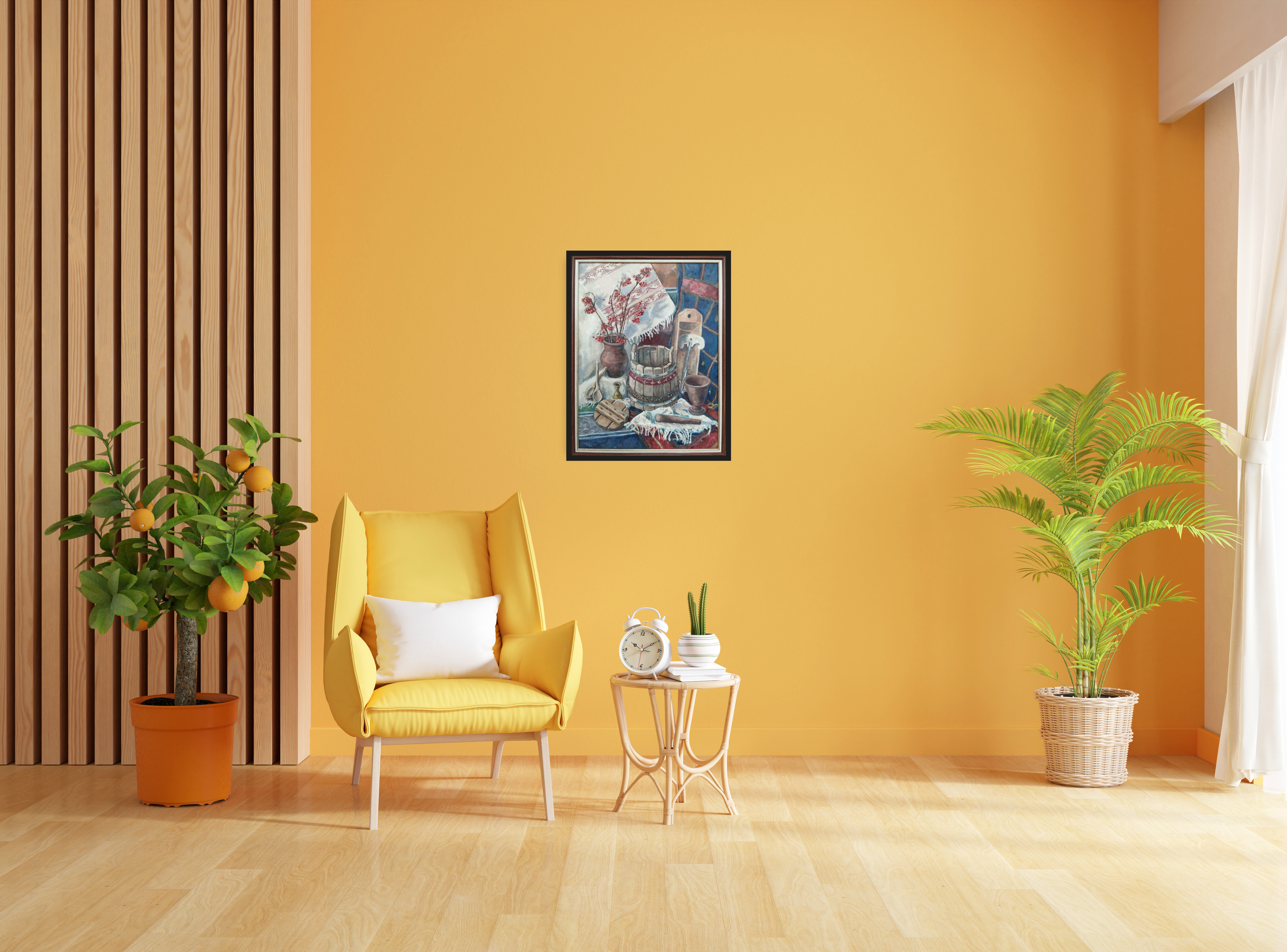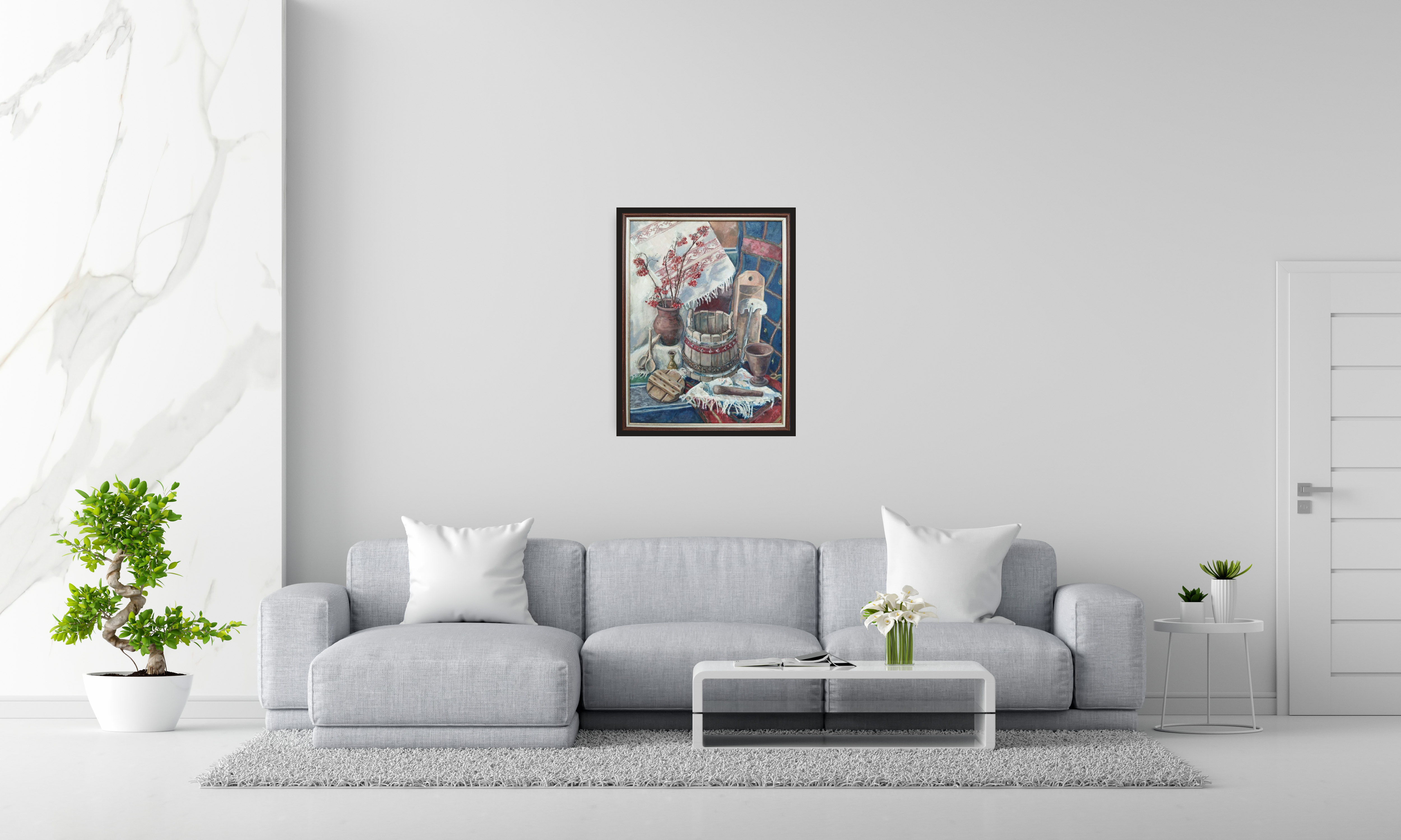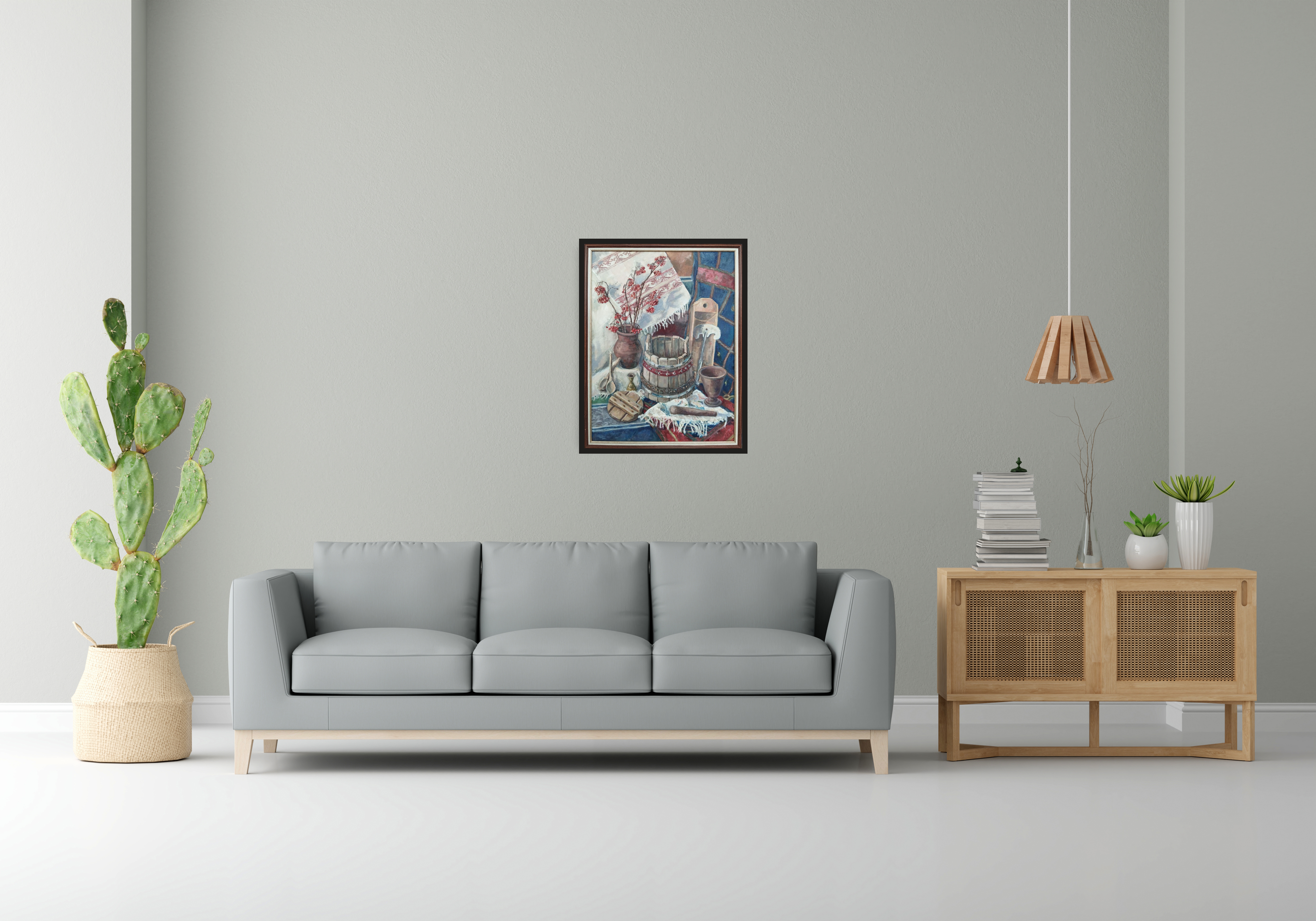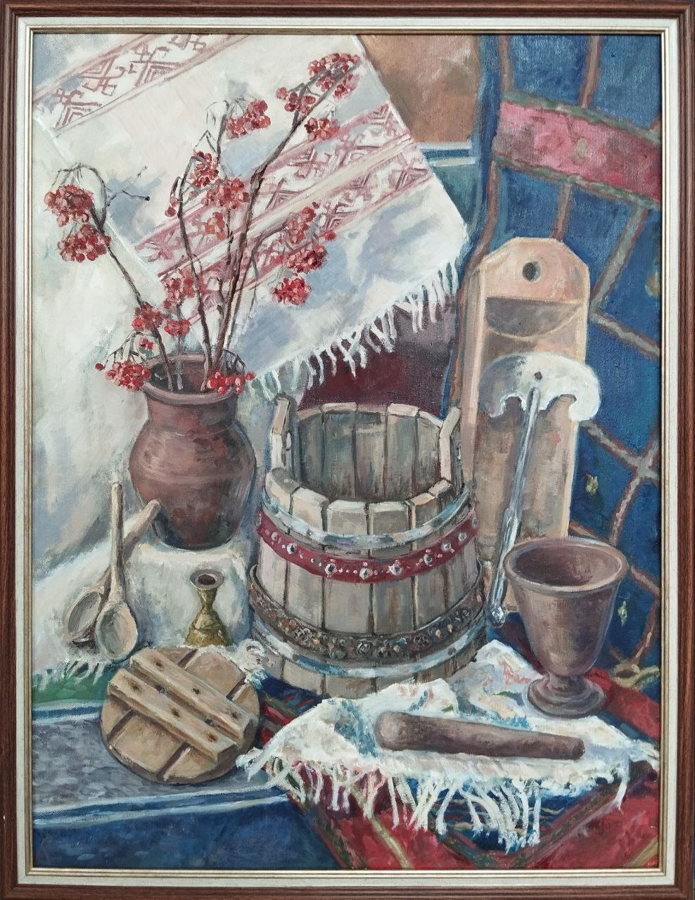 Каждый предмет в этой композиции— это символ и рассказчик. Кадушка для засолки — главный герой, воплощающий идею сохранения, запаса, домашнего труда. говорят о мастерстве работы с природным материалом, керамические крынка— о традициях гончарства, узорные полотенца — о национальной эстетике. Через этот собранный «этнический натюрморт» я хотела показать не просто набор вещей, а целостный, устоявшийся мир, где каждая деталь имеет своё практическое и культурное значение.