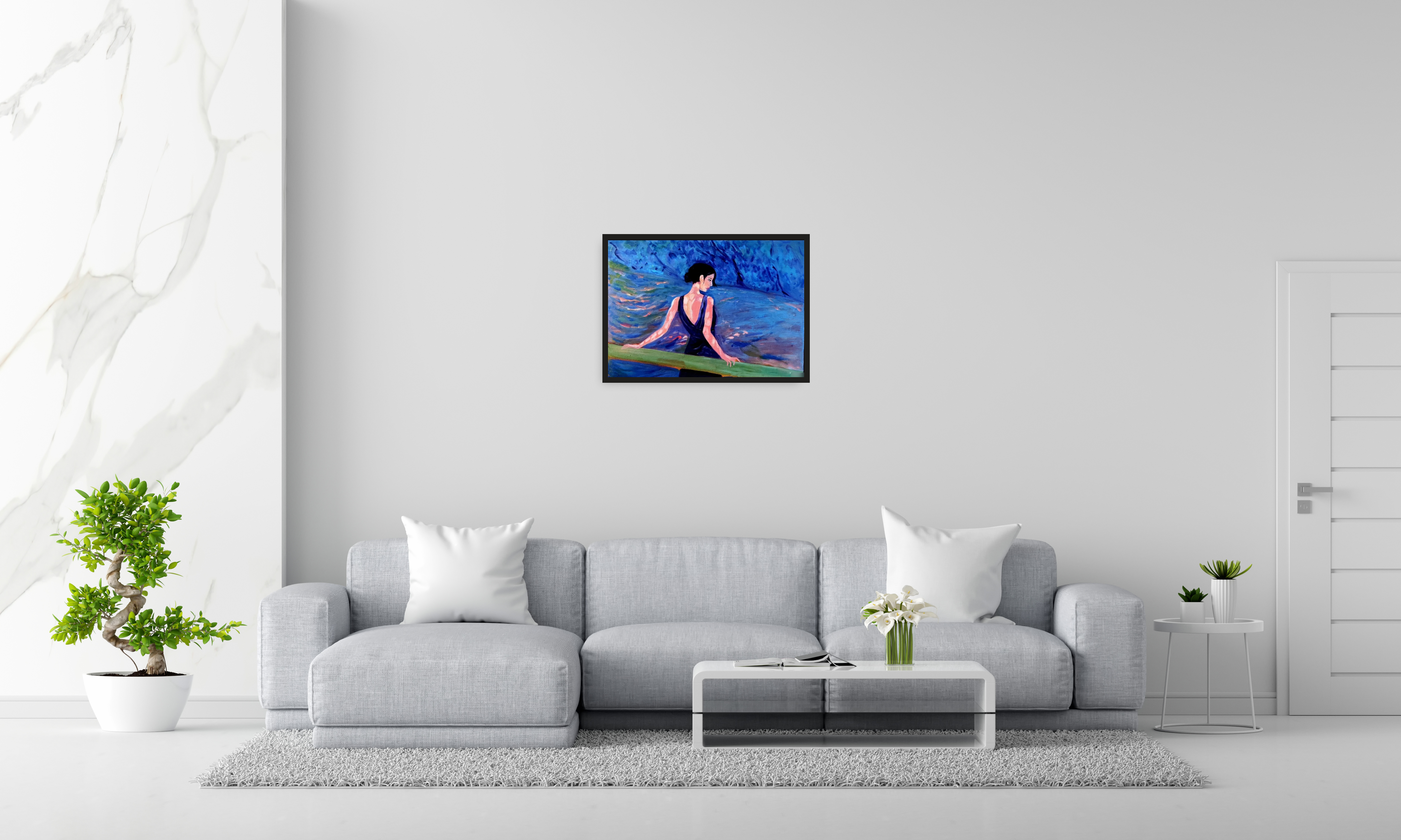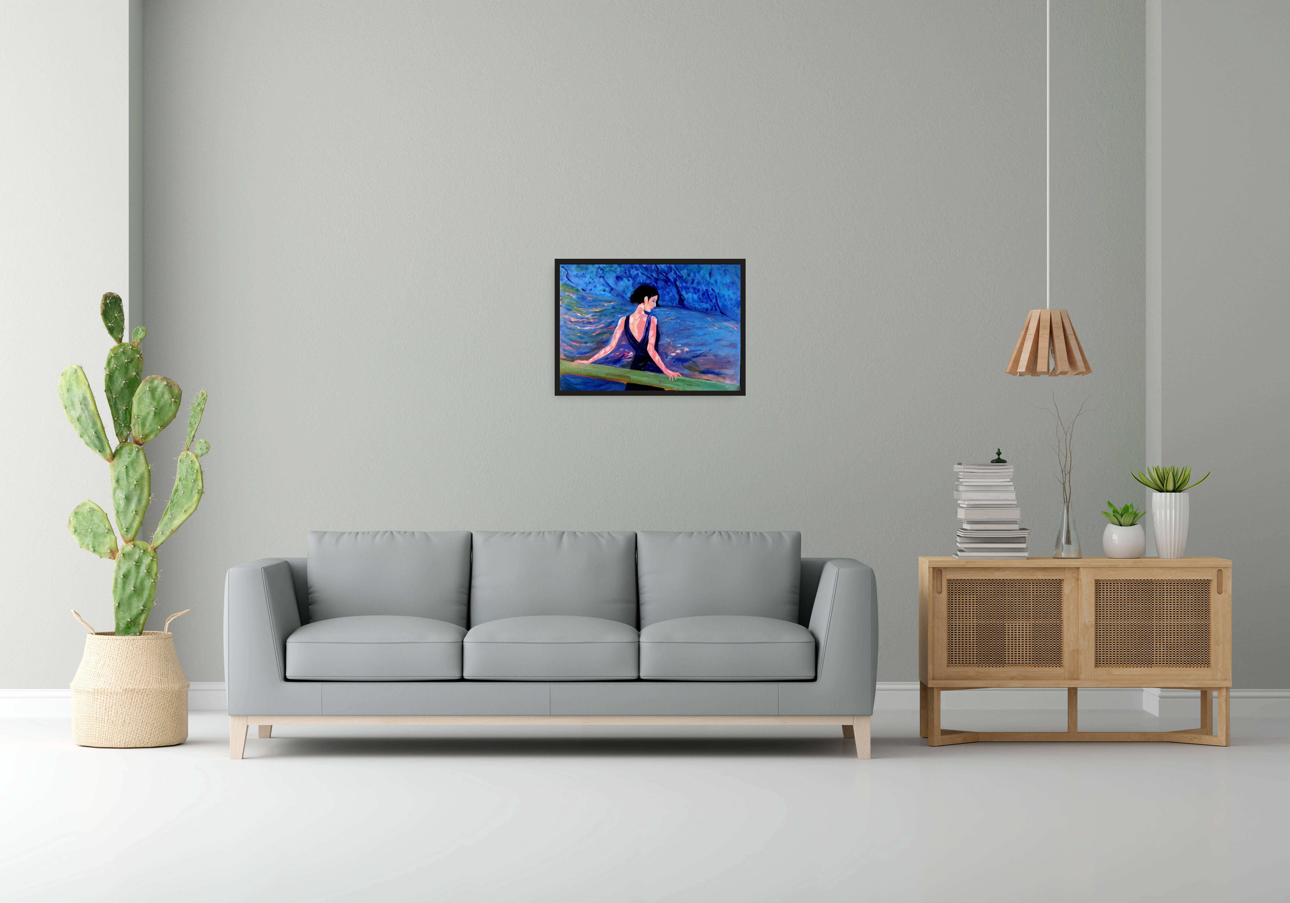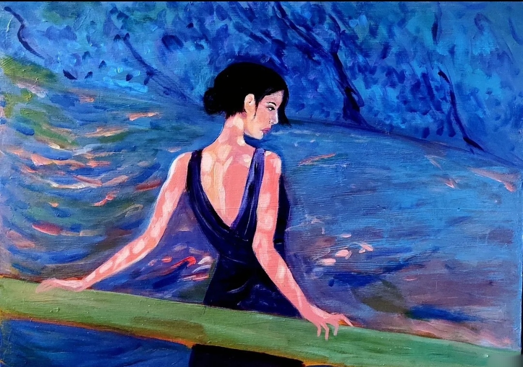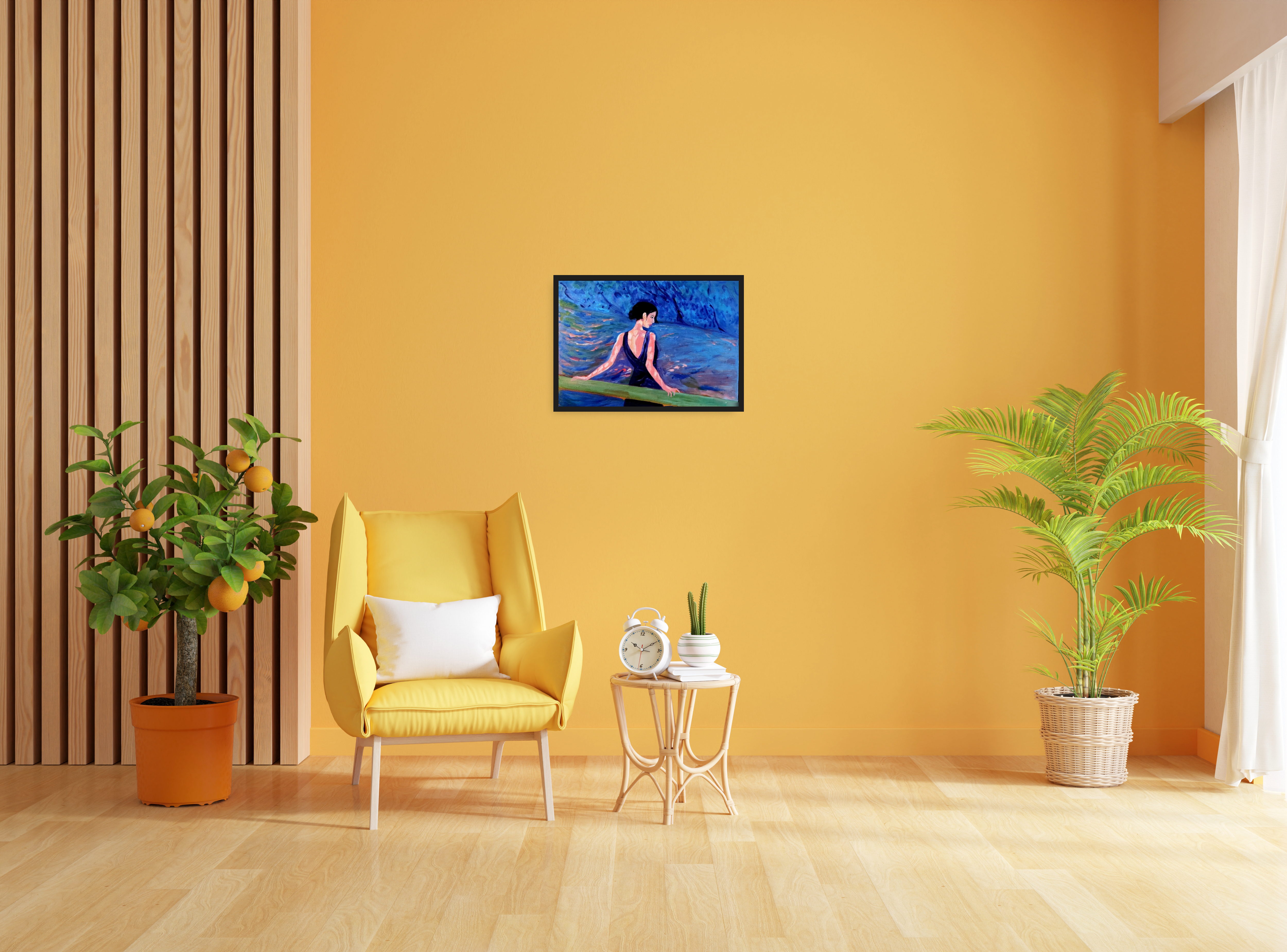 Яркие синие фиолетовые оттенки создают атмосферу легкости и свежести, а изображение девушки в парке добавляет динамику и оригинальность вашему пространству.