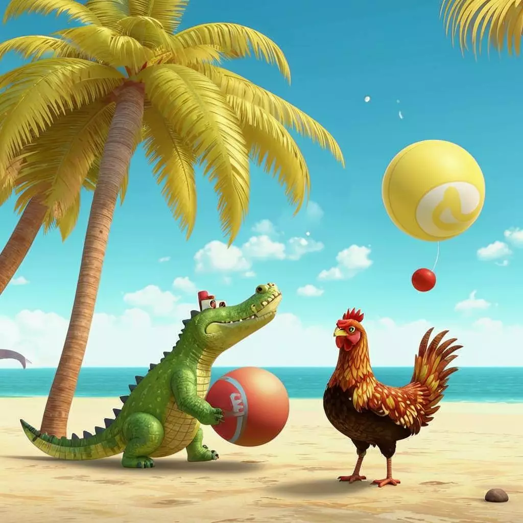 Крокодил и курица играют в мячик